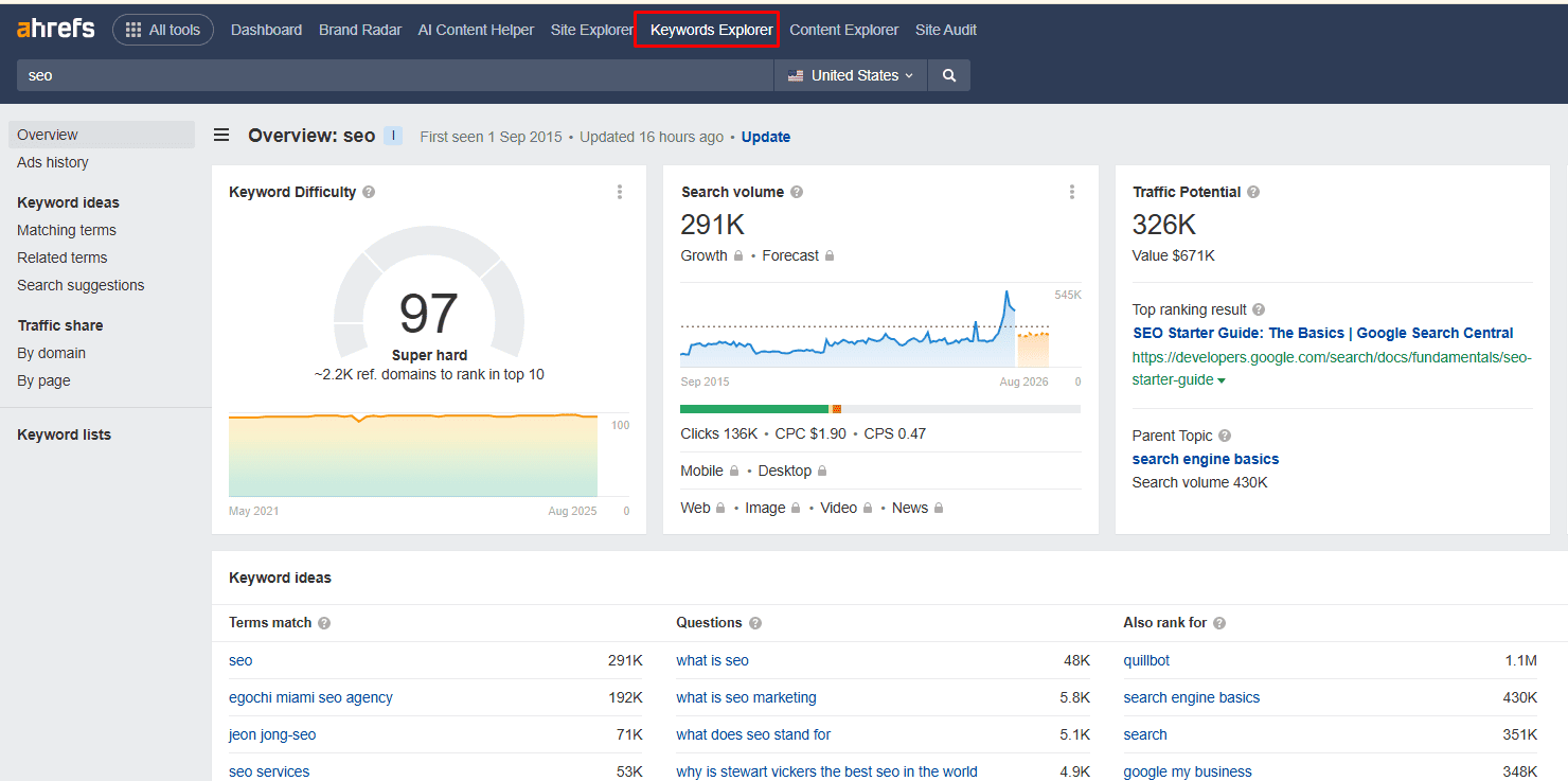 ✅ Keyword Explorer – Find profitable keywords with accurate search volumes, keyword difficulty, and click metrics. Identify high-value keywords for SEO & PPC campaigns.